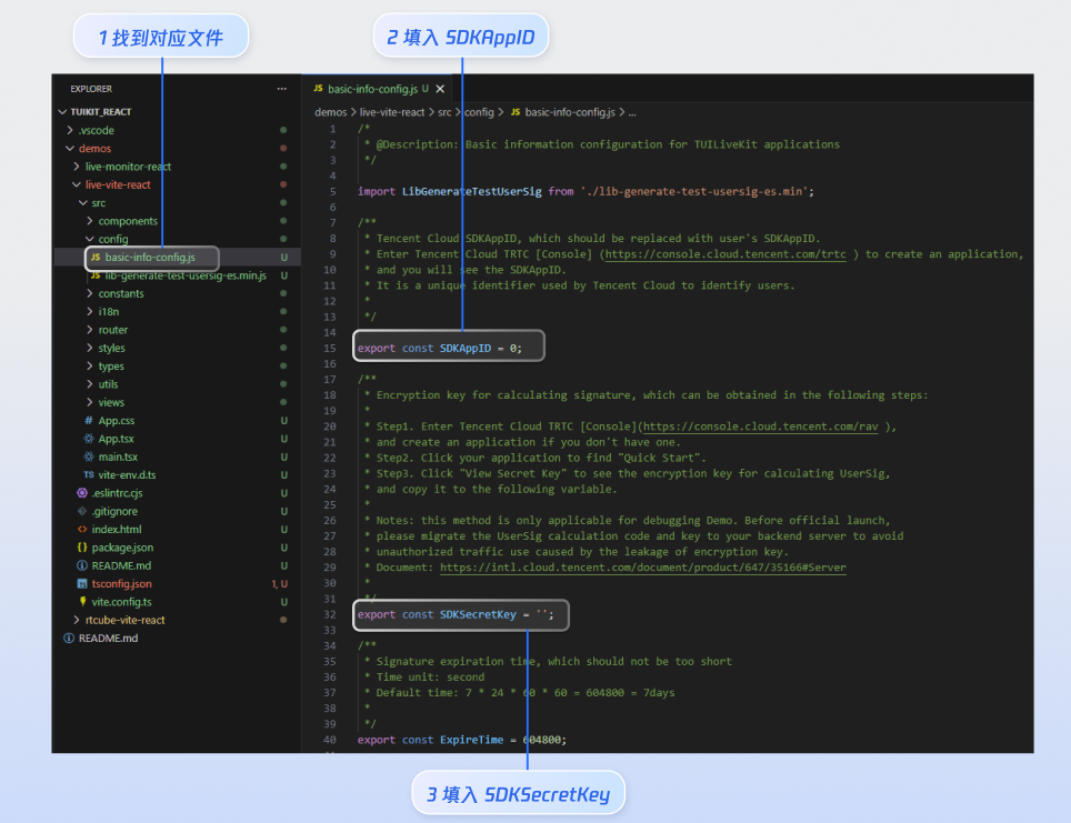 src/config/basic-info-config.js 文件,输入开通服务时获得的 SDKAppID 和 SDKSecretKey: