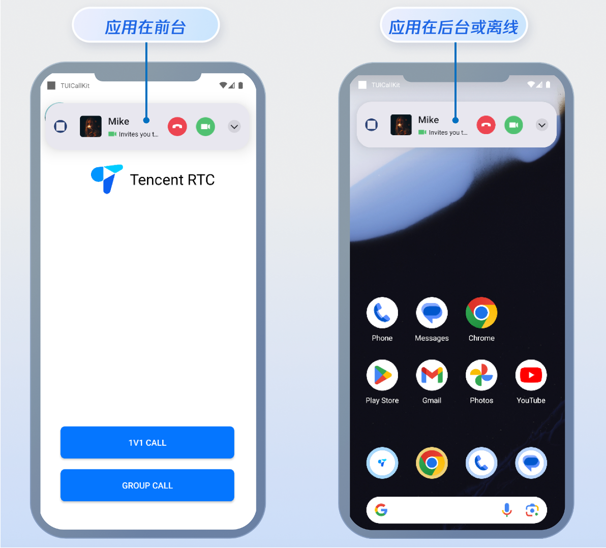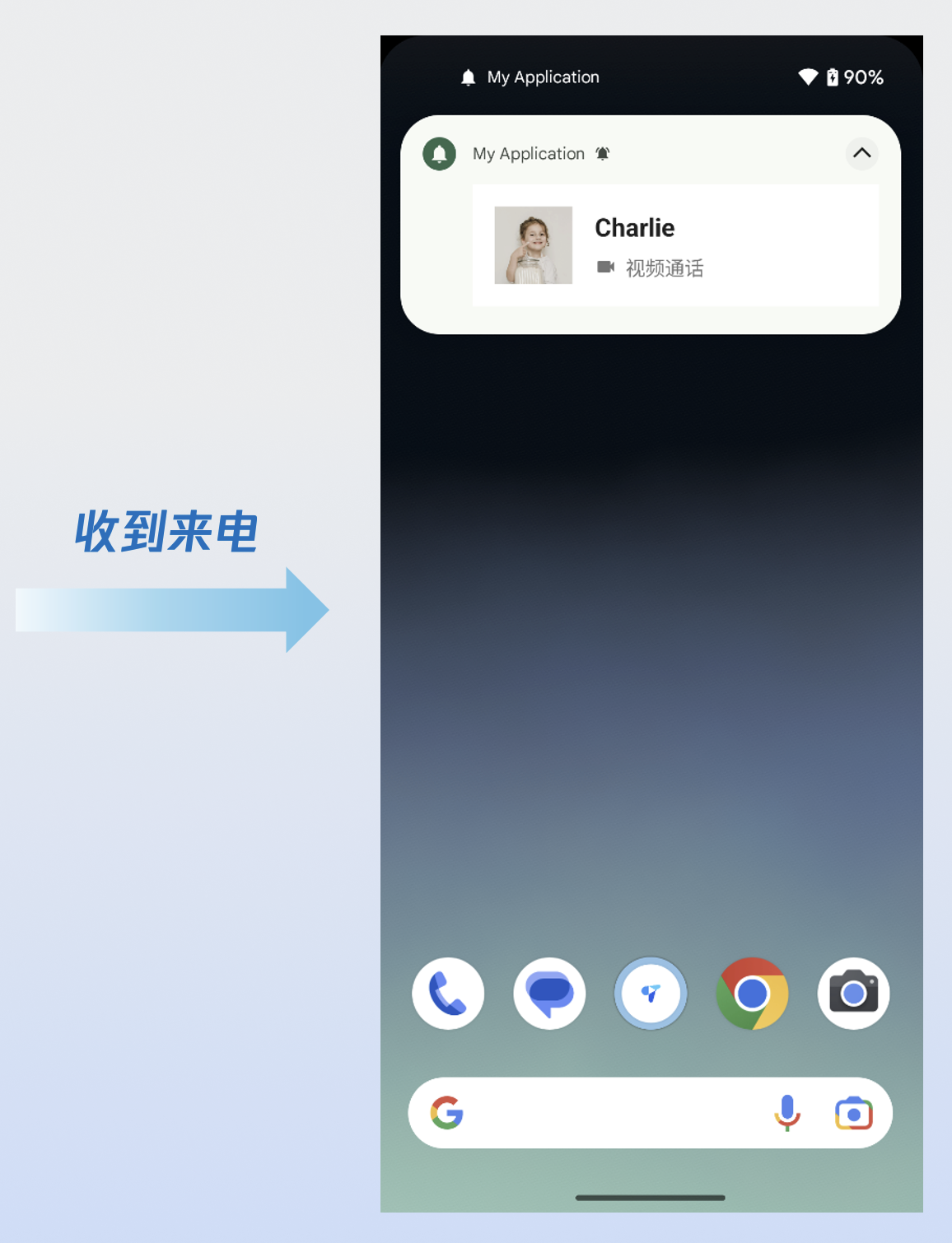 class MainActivity : AppCompatActivity() {private val wakeupReceiver = PushWakeupReceiver()private var callListener: CallListener? = nulloverride fun onCreate(savedInstanceState: Bundle?) {super.onCreate(savedInstanceState)// 1.监听来电事件observeCallReceived()}private fun observeCallReceived() {callListener = object : CallListener() {override fun onCallReceived(callId: String, mediaType: CallMediaType, userData: String) {super.onCallReceived(callId, mediaType, userData)// 2.显示来电通知showIncomingCallNotification(mediaType)}}callListener?.let { CallStore.shared.addListener(it) }}private fun showIncomingCallNotification(mediaType: CallMediaType) {try {val callerName = CallStore.shared.observerState.activeCall.value.inviterIdval notificationManager = IncomingCallNotificationManager(this)notificationManager.showIncomingCallNotification(callerName = callerName,callerAvatar = R.drawable.callview_ic_avatar,isVideoCall = mediaType == CallMediaType.Video)} catch (e: Exception) {}}}