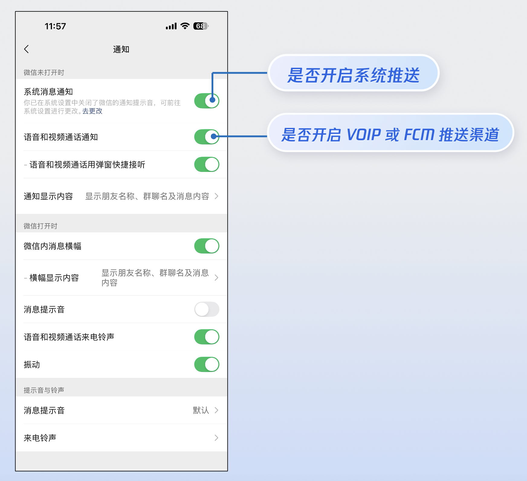 NotificationManager 通知管理类显示您定制的来电通知界面,实现方式如下:IncomingCallNotificationManager):封装推送的创建和显示等逻辑。RemoteViews 定制通知布局。关于如何使用 NotificationCompat.Builder 配置通知的详细参数(如 Channel、PendingIntent、优先级等),请参阅 Android 官方文档:NotificationCompat.Builder。import android.app.Notificationimport android.app.NotificationChannelimport android.app.NotificationManagerimport android.content.Contextimport android.content.Intentimport android.os.Buildimport android.widget.RemoteViewsimport androidx.core.app.NotificationCompatclass IncomingCallNotificationManager(private val context: Context) {private val channelId = "incoming_call_channel"private val channelName = "来电通知"private val notificationId = 1001private var remoteViews: RemoteViews? = nullprivate val notificationManager: NotificationManager =context.getSystemService(Context.NOTIFICATION_SERVICE) as NotificationManagerinit {// 1.创建通知渠道createNotificationChannel()}private fun createNotificationChannel() {if (Build.VERSION.SDK_INT >= Build.VERSION_CODES.O) {val channel = NotificationChannel(channelId, // 渠道 ID(唯一标识)"来电通知", // 渠道名称(用户可见)NotificationManager.IMPORTANCE_HIGH // 重要性:高优先级).apply {description = "显示来电通知" // 渠道描述(用户可见)enableLights(true) // 启用通知灯enableVibration(true) // 启用震动setShowBadge(false) // 不显示角标}notificationManager.createNotificationChannel(channel)}}// 2. 显示自定义来电通知的 UI 样式fun showIncomingCallNotification(callerName: String,callerAvatar: Int?, // Bitmap 或 Int (资源 ID)isVideoCall: Boolean) {// RemoteViews 用于在通知中显示自定义的布局remoteViews = RemoteViews(context.packageName, R.layout.incoming_call_notification)// 设置来电者姓名remoteViews?.setTextViewText(R.id.tv_caller_name, callerName)// 设置通话类型描述(视频通话 或 语音通话)remoteViews?.setTextViewText(R.id.tv_call_desc, if (isVideoCall) "视频通话" else "语音通话")// 设置通话类型图标val callTypeIcon = if (isVideoCall) {R.drawable.ic_video_call} else {R.drawable.ic_audio_call}remoteViews?.setImageViewResource(R.id.img_call_type, callTypeIcon)// 设置呼叫用户头像remoteViews?.setImageViewResource(R.id.img_avatar, callerAvatar)// 创建通知对象val notification = NotificationCompat.Builder(context, channelId).setSmallIcon(R.drawable.ic_notification_small) // 状态栏显示的小图标.setContent(remoteViews) // 设置自定义布局.setCustomContentView(remoteViews) // 标准视图(通知栏收起时).setCustomBigContentView(remoteViews) // 展开视图(通知栏展开时).setOngoing(true) // 持续通知(用户无法滑动删除).setAutoCancel(true) // 点击后自动取消.setCategory(NotificationCompat.CATEGORY_CALL) // 分类为通话通知.setVisibility(NotificationCompat.VISIBILITY_PUBLIC) // 锁屏时可见.setTimeoutAfter(60000) // 60秒后自动取消.build()notificationManager.notify(notificationId, notification)}}