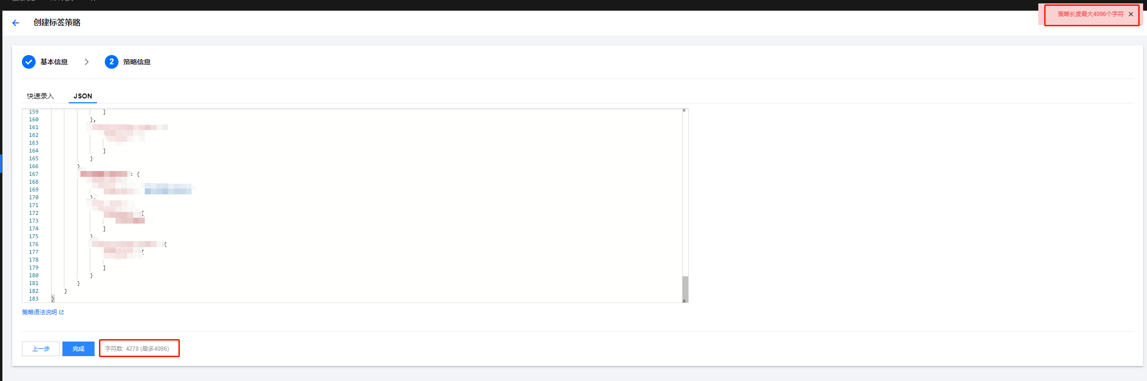 {"tags": {"principal负责人": {"tag_key": {"@@assign": "principal负责人"},"tag_value_dynamic": {"@@assign": "on"},//开启动态值,取值以子用户在访问管理中绑定的同名标签键的值为准"resource_type_scope":{"@@assign": ["cvm:instance", "cvm:volume"] },"detection":{"@@assign": "on"},//检测是系统默认启用功能,将按照指定资源指定标签键检测标签值是否合规默认开启,在json中默认不显示"correction": {"@@assign": "on"},//自动修复,动态值只有一个值,可开启自动修复"auto_assign":{"@@assign":"on"},//自动赋值-标签键"enforced_for": { "@@assign": [ "*"] }, //强制执行。当值不为"value姓名1"则拦截、不允许绑定其他值"auto_assign_value": { "@@assign": "on" } //自动赋值-标签值}}}