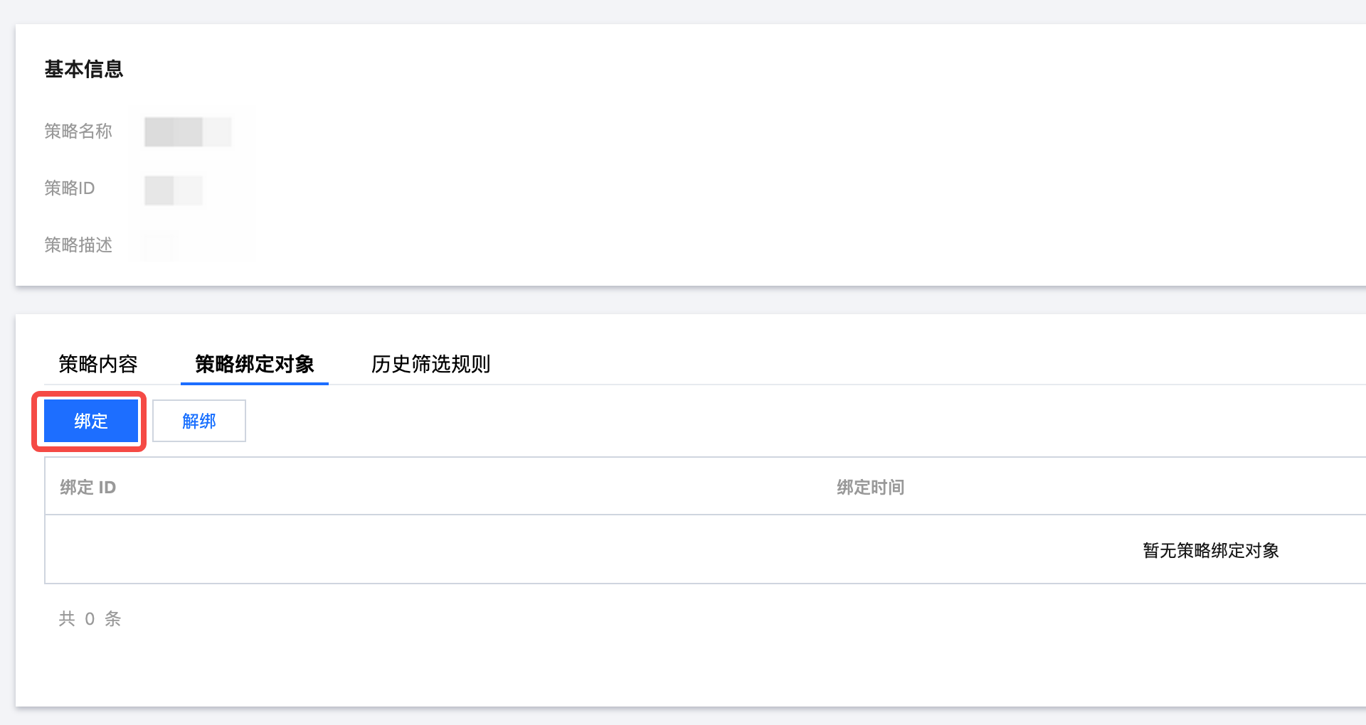 2. 单击策略绑定对象,在策略绑定对象页签中,单击绑定。