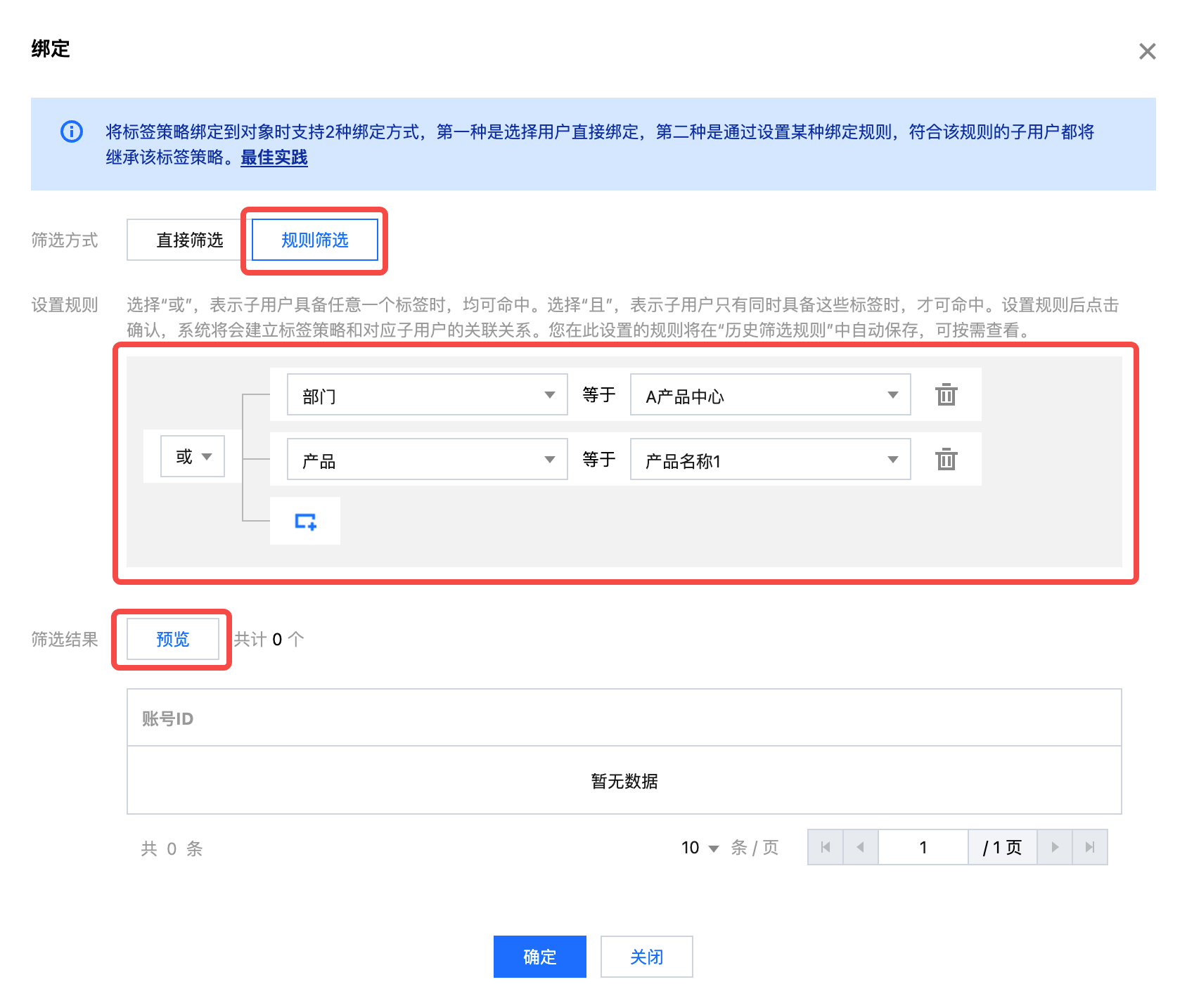 第二种规则筛选,通过设置某种筛选规则,符合该规则的子用户都将被筛选出来,然后绑定到该标签策略。适用于需要分批将标签策略应用到子用户的场景。例如子用户数量非常多,需要先给一部分子用户绑定,再给另一部分子用户绑定。