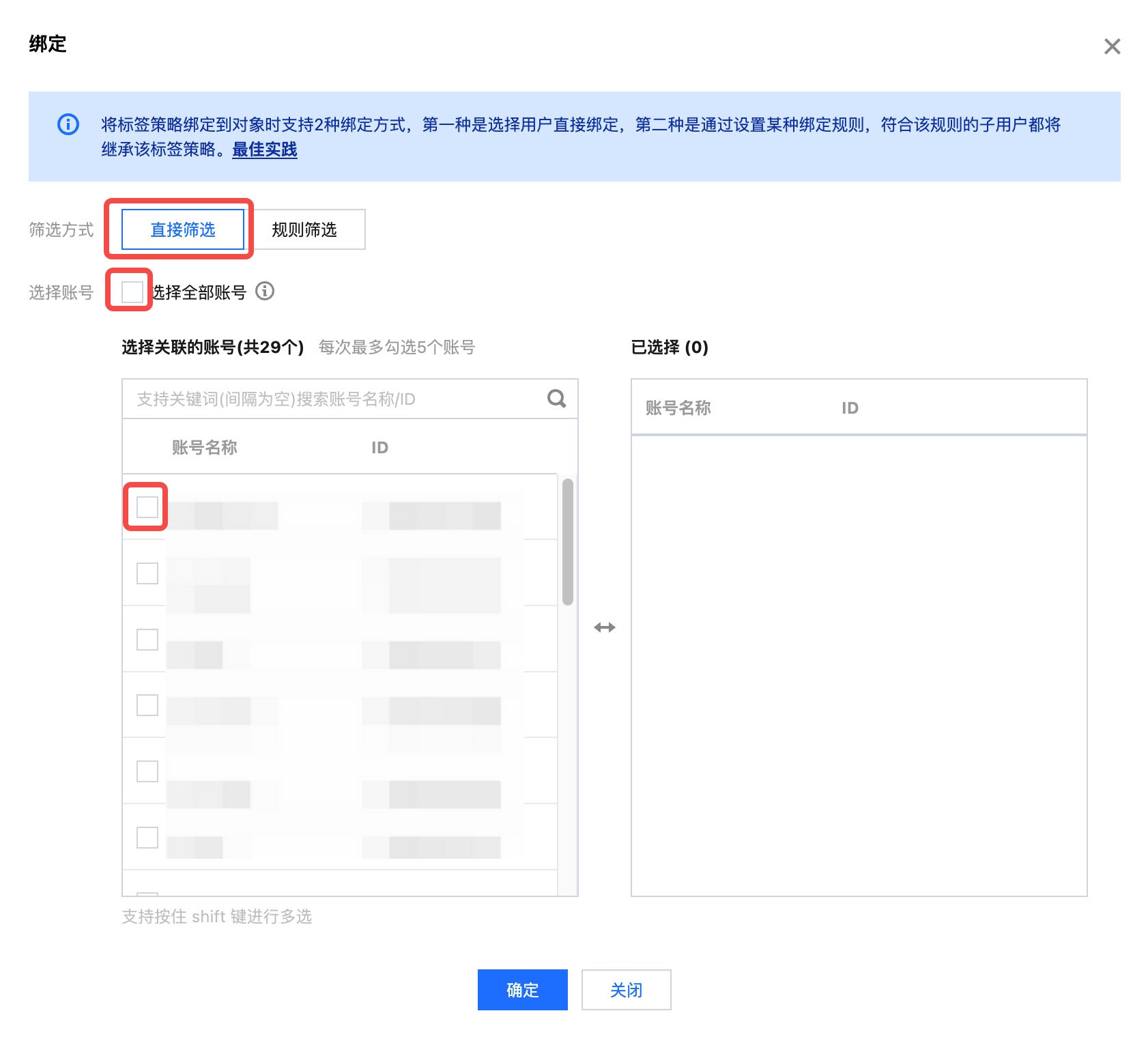 当筛选方式为直接筛选,选择全部账号时,将记录为直接绑定全部