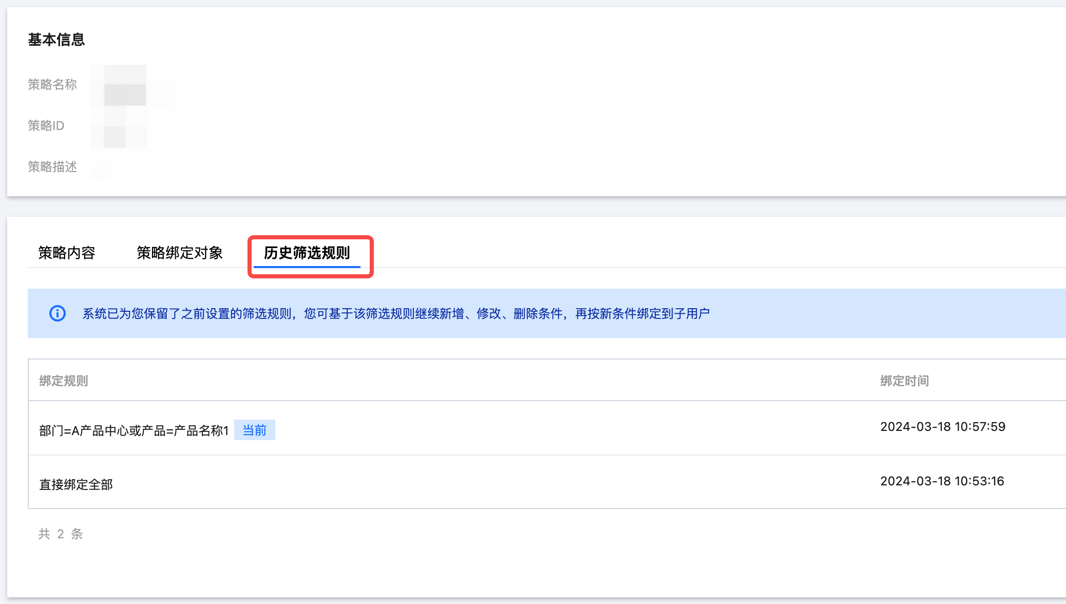 当筛选方式为规则筛选,设置键值规则时,将记录实际条件,例如部门=A产品中心 或 产品=产品名称1