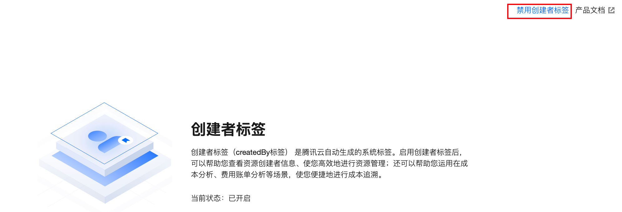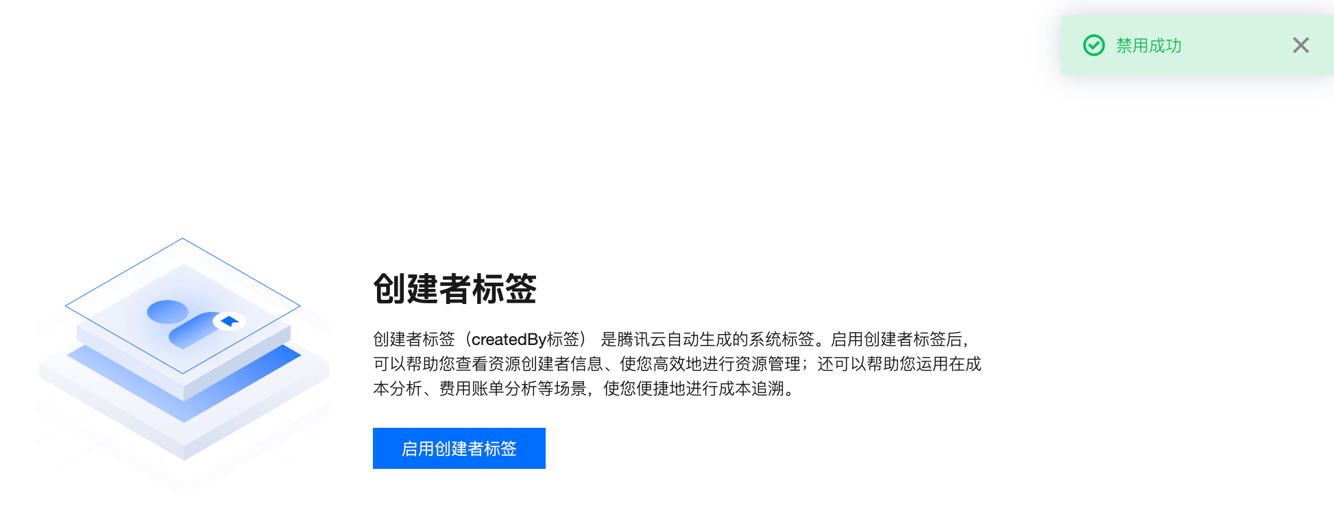 页面提示“禁用成功”,且状态恢复到启用前,表示创建者标签已禁用。后续新建资源将不会再被绑定该标签。