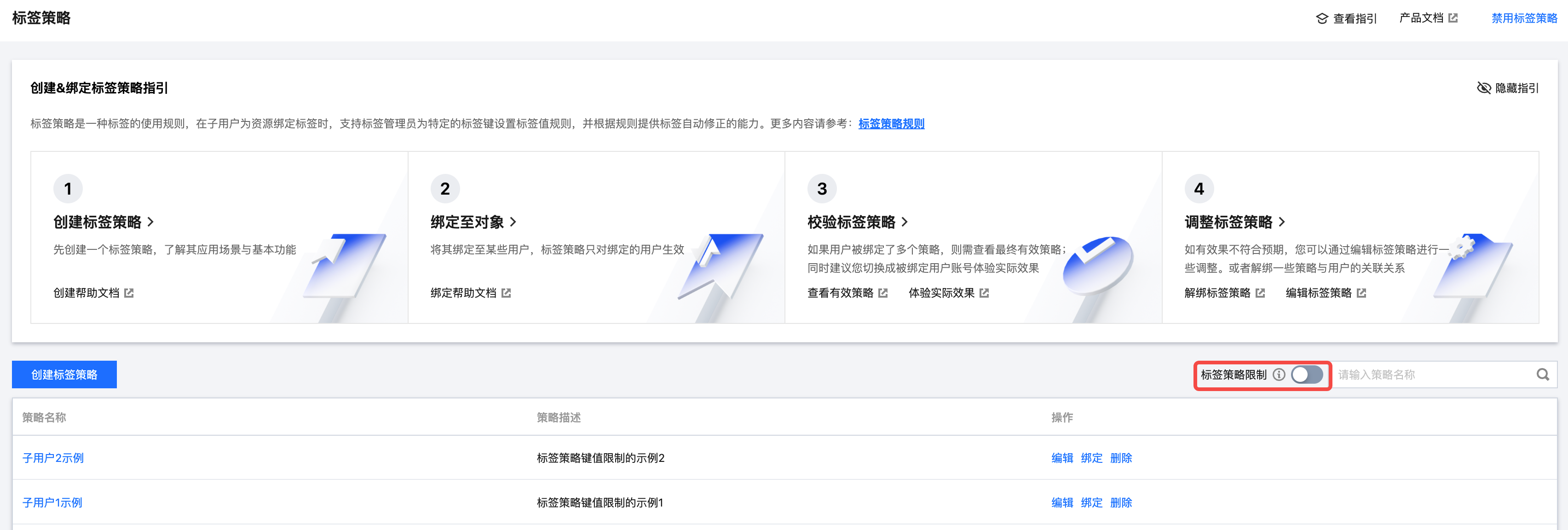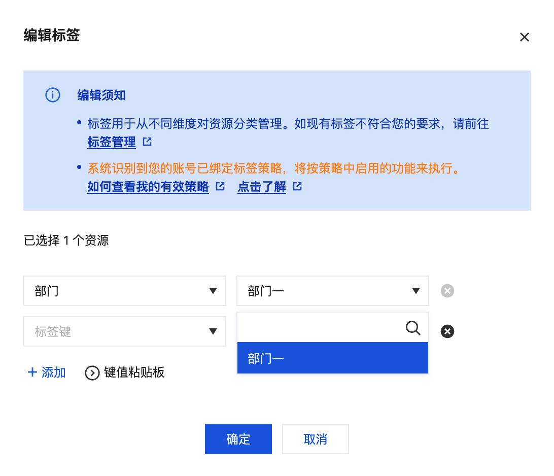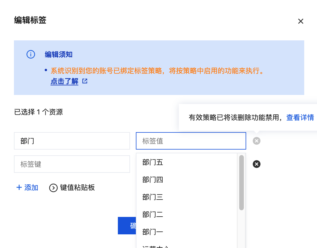 部门。部门:部门一,子用户2只能使用部门:部门二和部门:部门三。"auto_assign": {"@@assign": "on"}表示,部门这个标签键,对于子用户1和子用户都设置了标签键的自动赋值。"auto_assign_value": {"@@assign": "on"}表示给子用户1设置了标签值的自动赋值,因为其的标签值唯一、无需手动选择。而子用户2的部门标签值不唯一,需要子用户2自行选择,因此不在策略中设置。{"tags": {"部门": {"tag_key": {"@@assign": "部门"},"tag_value": {"@@assign": ["部门一"]},"resource_type_scope": {"@@assign": ["*"]},"auto_assign": {"@@assign": "on"},"auto_assign_value": {"@@assign": "on"}}}}