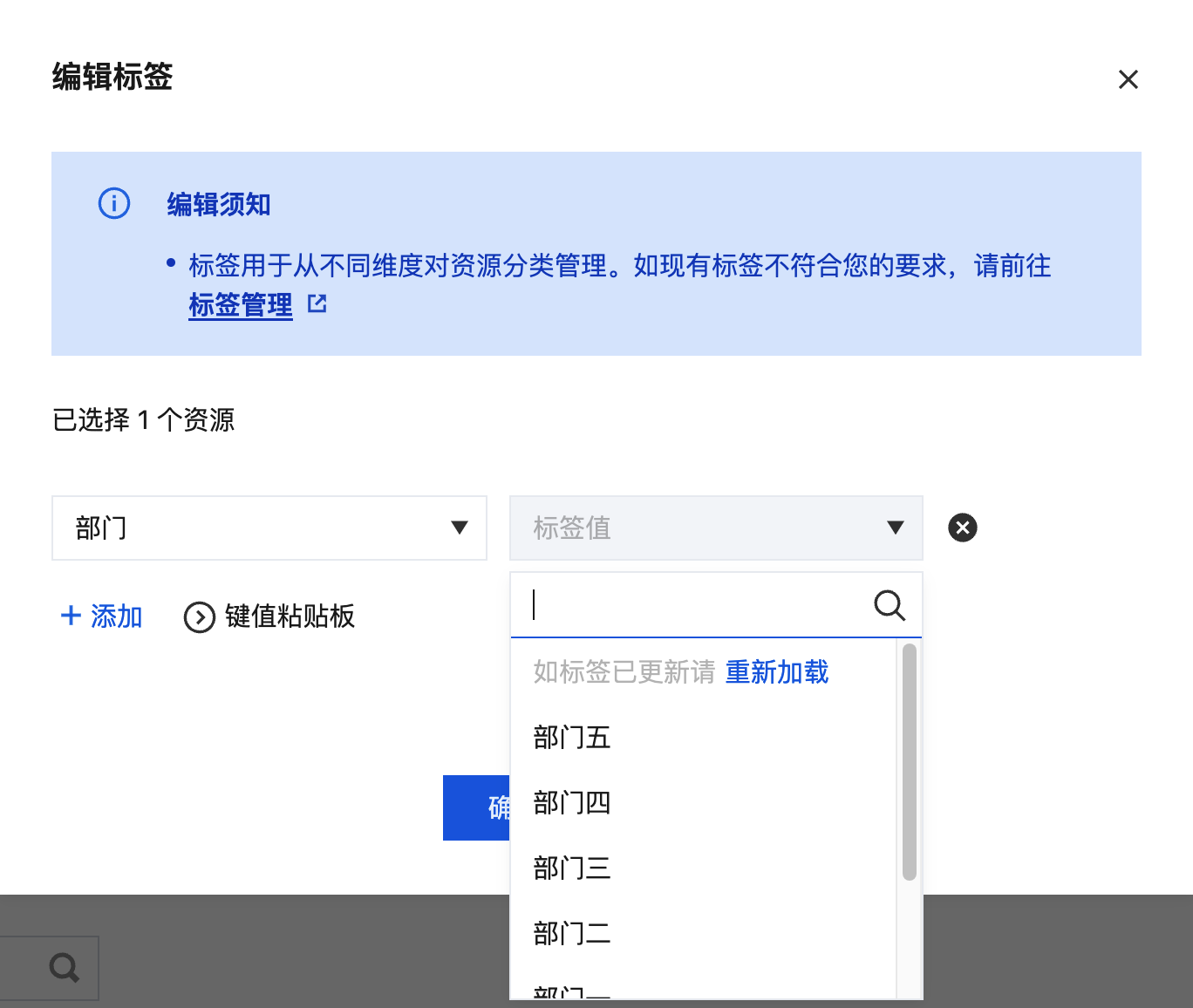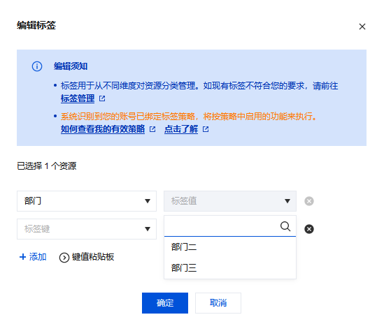 {"tags": {"部门": {"tag_key": {"@@assign": "部门"},"tag_value": {"@@assign": ["部门二","部门三"]},"resource_type_scope": {"@@assign": ["*"]},"auto_assign": {"@@assign": "on"}}}}