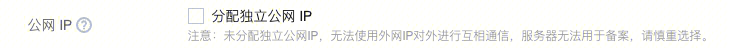 购买 CVM(不需要公网带宽) | 不勾选“分配独立公网 IP”: ![]() | 在调用 RunInstances 接口创建云服务器时,关注“InternetAccessible”参数:“InternetChargeType”不传、“InternetMaxBandwidthOut”不传或设置为0。 | 升级前:在 CVM 上购买公网带宽,无需同时分配公网 IP。 升级后:购买 CVM 时如需公网带宽,则必须同时购买分配公网 IP,并设置公网 IP 的计费模式及带宽上限。 |