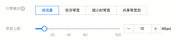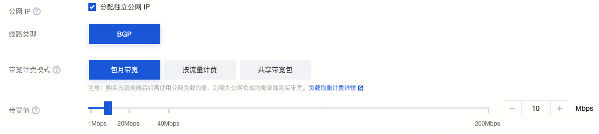 购买 CVM 或弹性伸缩服务(需要公网带宽) | 勾选“分配独立公网 IP”,并设置“带宽计费模式”和“带宽值”: ![]() | “InternetChargeType”设置带宽计费模式,且当计费模式设置为“BANDWIDTH_PACKAGE”时,必须在“BandwidthPackageId”中指定要加入的共享带宽包 ID。 “InternetMaxBandwidthOut”设置公网带宽上限。 “PublicIpAssigned”设置为“true”用于分配公网 IP。 | |