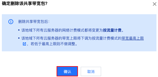 删除设备带宽包后,该地域下的所有云服务器的网络计费模式都将变更为按流量计费,带宽上限将下调为按流量计费模式的