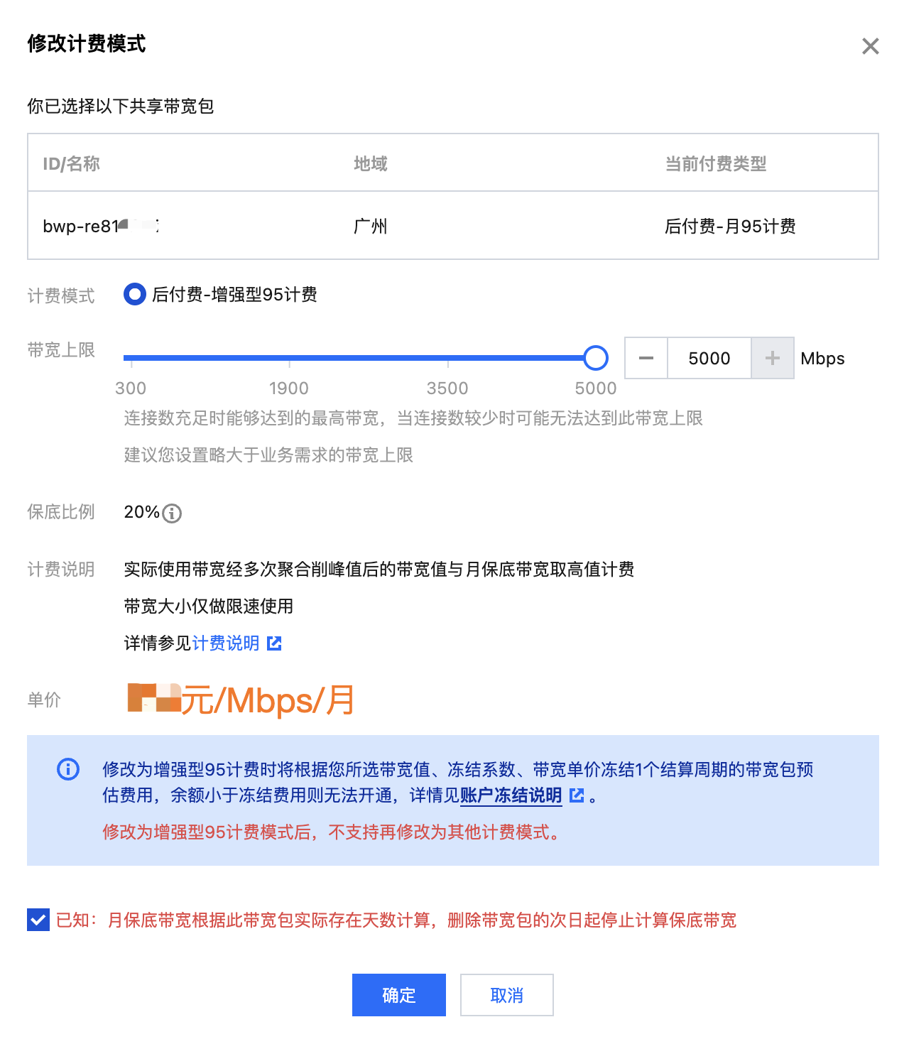 您的账户下存在后付费 - 月95计费带宽包、或 TOP5 计费带宽包时,支持修改计费模式为后付费-增强型95计费模式。