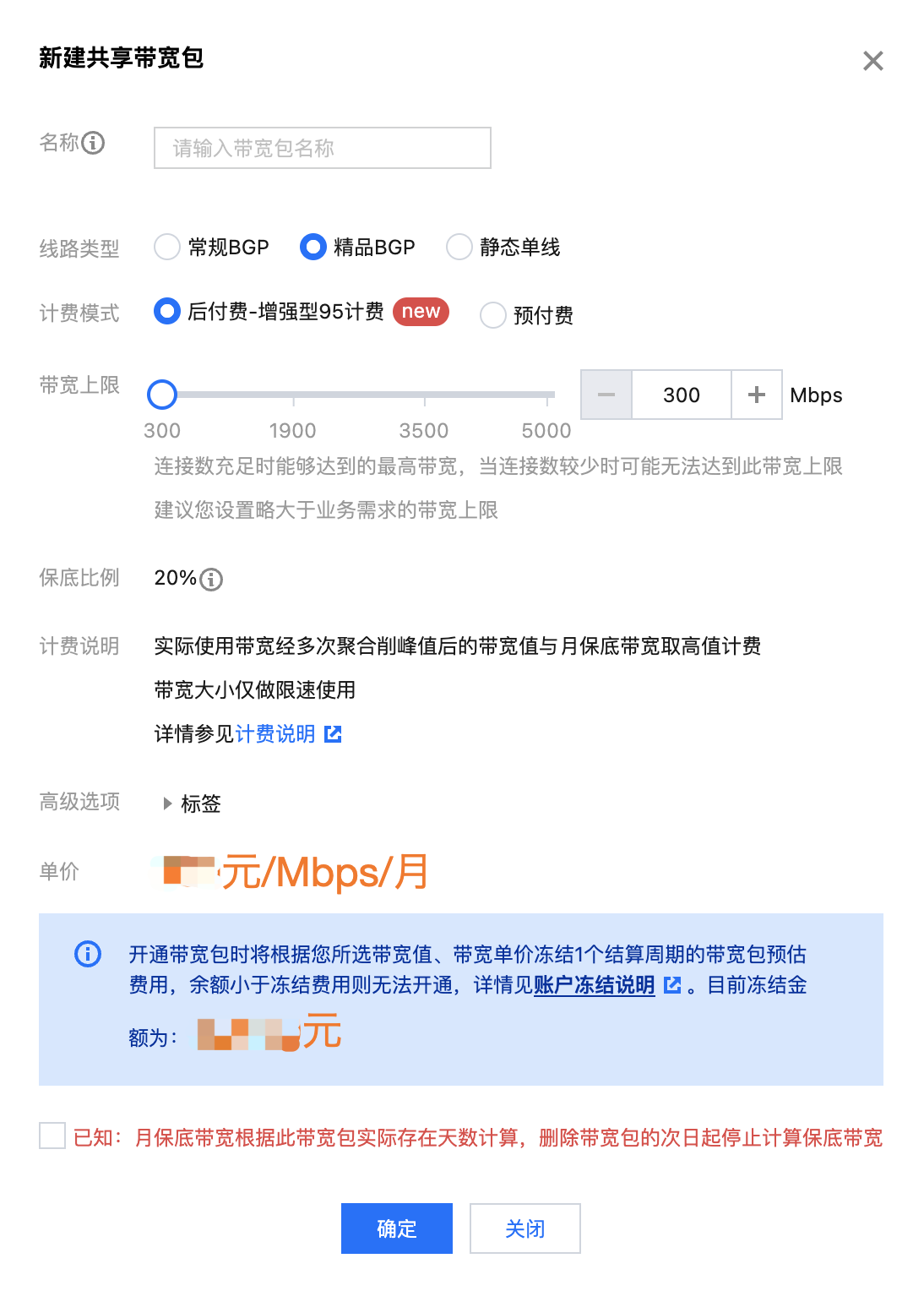 3. 在新建共享带宽包对话框中,输入名称,选择精品BGP线路类型和计费模式,设置带宽上限,单击确定。