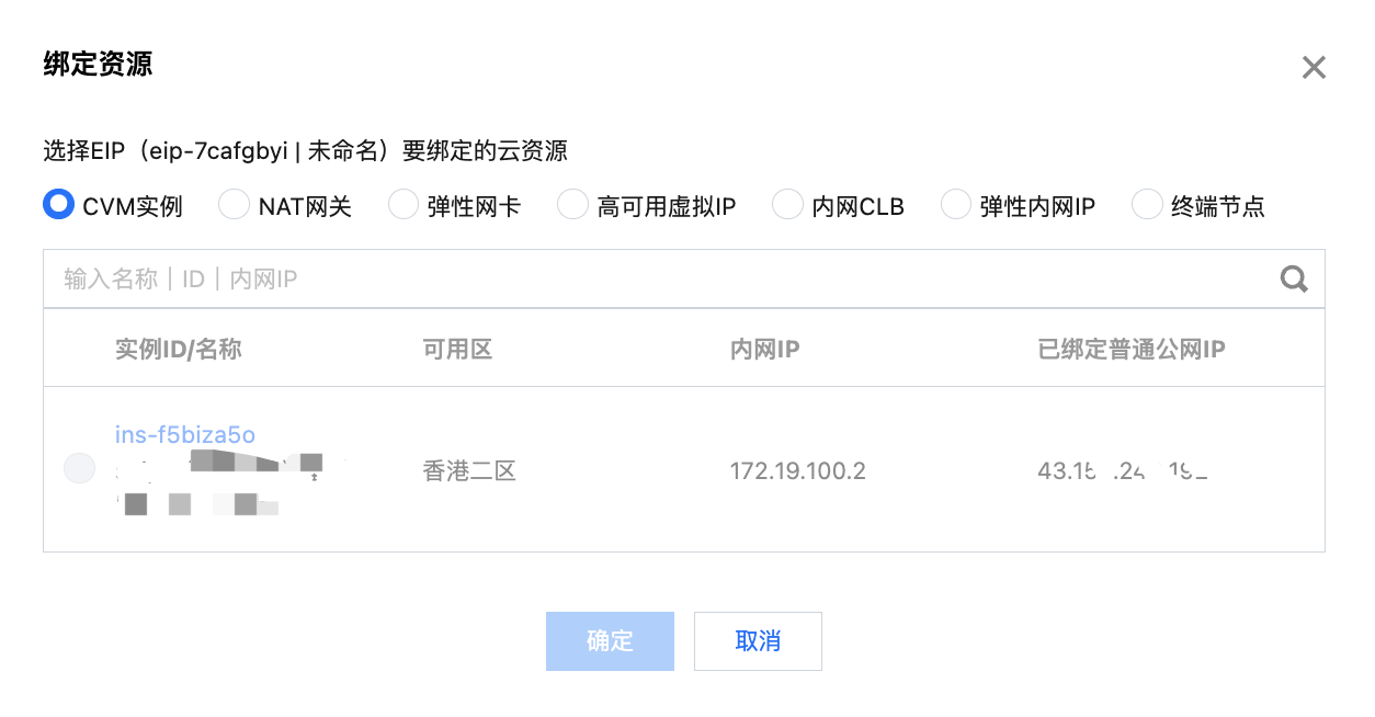 3. 在弹出的绑定资源窗口中,选择需绑定的云资源类型和云资源,单击确定。