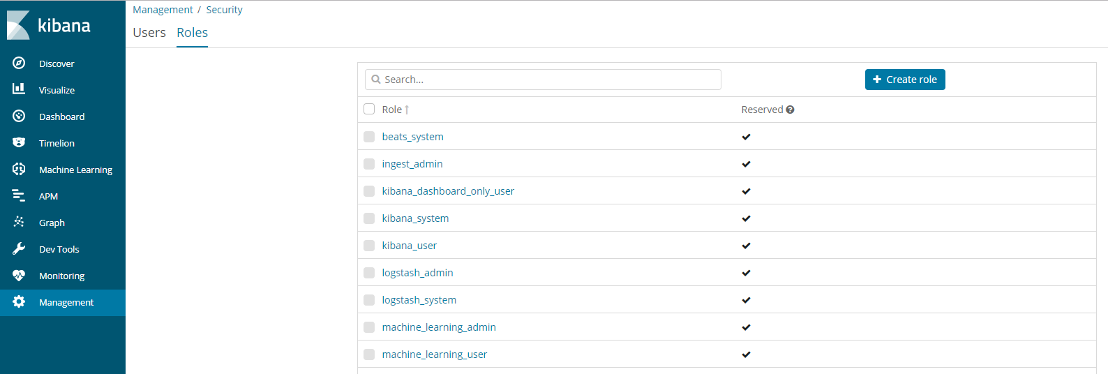 用户可以在 Kibana 的 Management > Security > Roles 中创建、修改和删除具有不同权限组合的角色,详情如下: