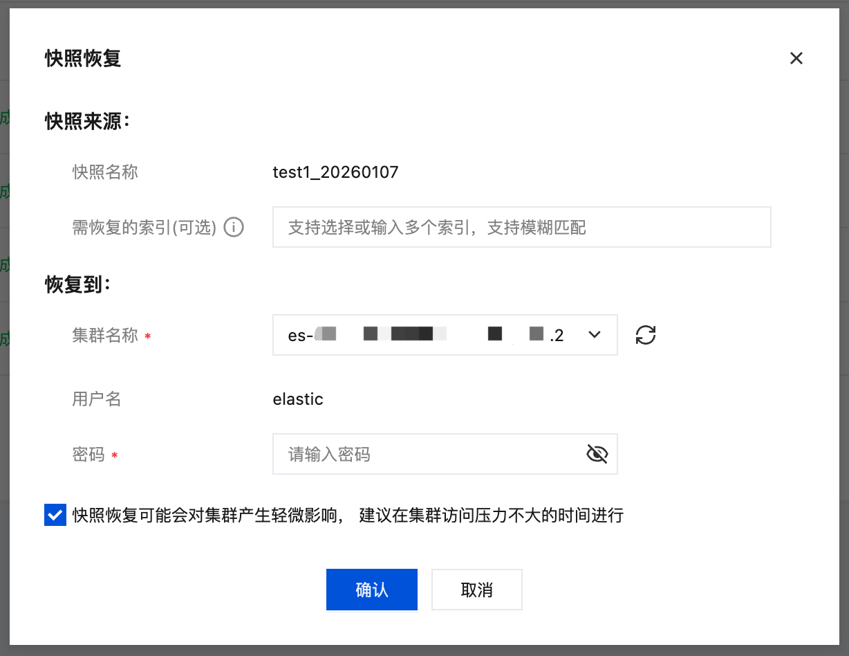 登录 Elasticsearch Service 控制台,在集群列表,单击集群 ID/名称进入集群详情页,在“备份管理”页面的备份数据列表中找到需要用于恢复的快照,单击操作栏中的恢复按钮,选择需要恢复的索引、要恢复到的目标集群,并输入目标集群的用户密码即可将所选备份恢复到目标集群。 需要恢复的索引为可选项,不指定具体索引即全量恢复全部索引。