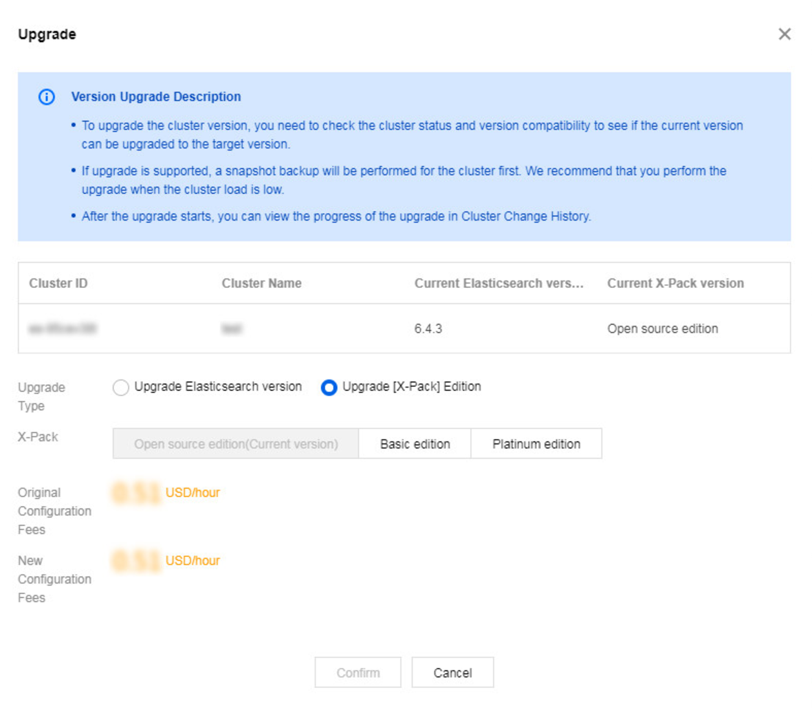 特殊的:ES 主版本升级,例如 ES 5.x 版本升级到6.x版本,可以同时把高级特性从开源版升级到基础版。我们也建议您选择基础版高级特性,其包含监控、SQL 等高级版功能。升级到6.8及以上基础版,还可以选择勾选 ES 集群用户登录认证,此时需要全量重启,期间集群会停服,服务不可访问,请谨慎选择。