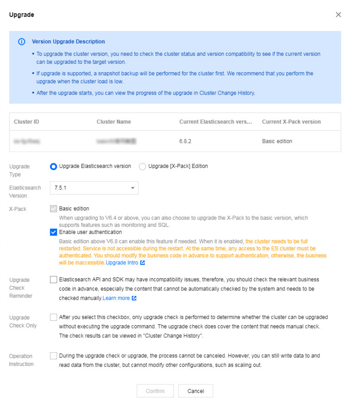 若升级过程涉及 ES 集群用户登录认证从关闭到开启,集群需要全量重启,期间集群会停服,服务不可访问,请谨慎选择。