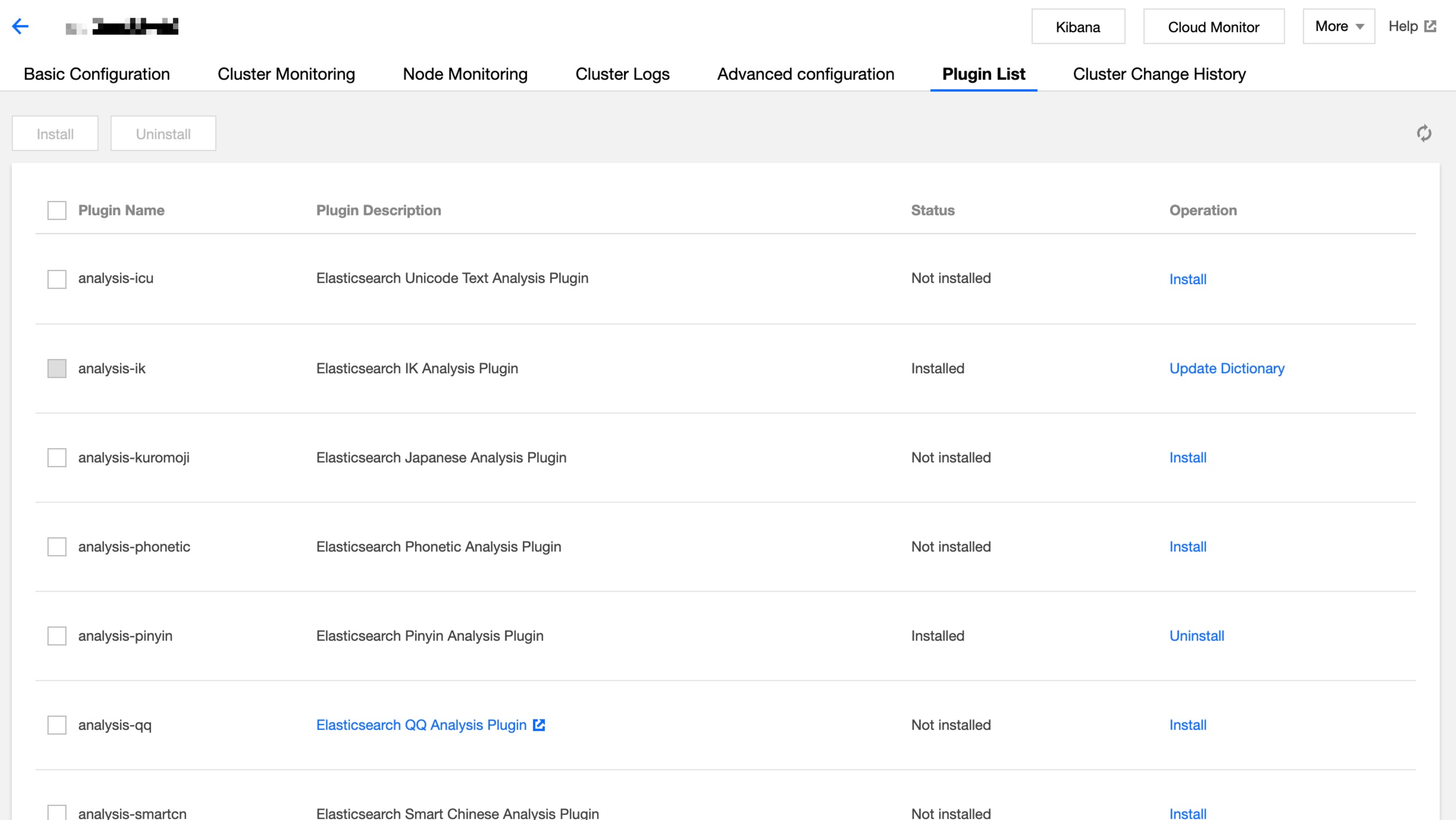 analysis-ik | 已安装 | Elasticsearch IK 分析插件,默认不能卸载。 | 更新词典 |