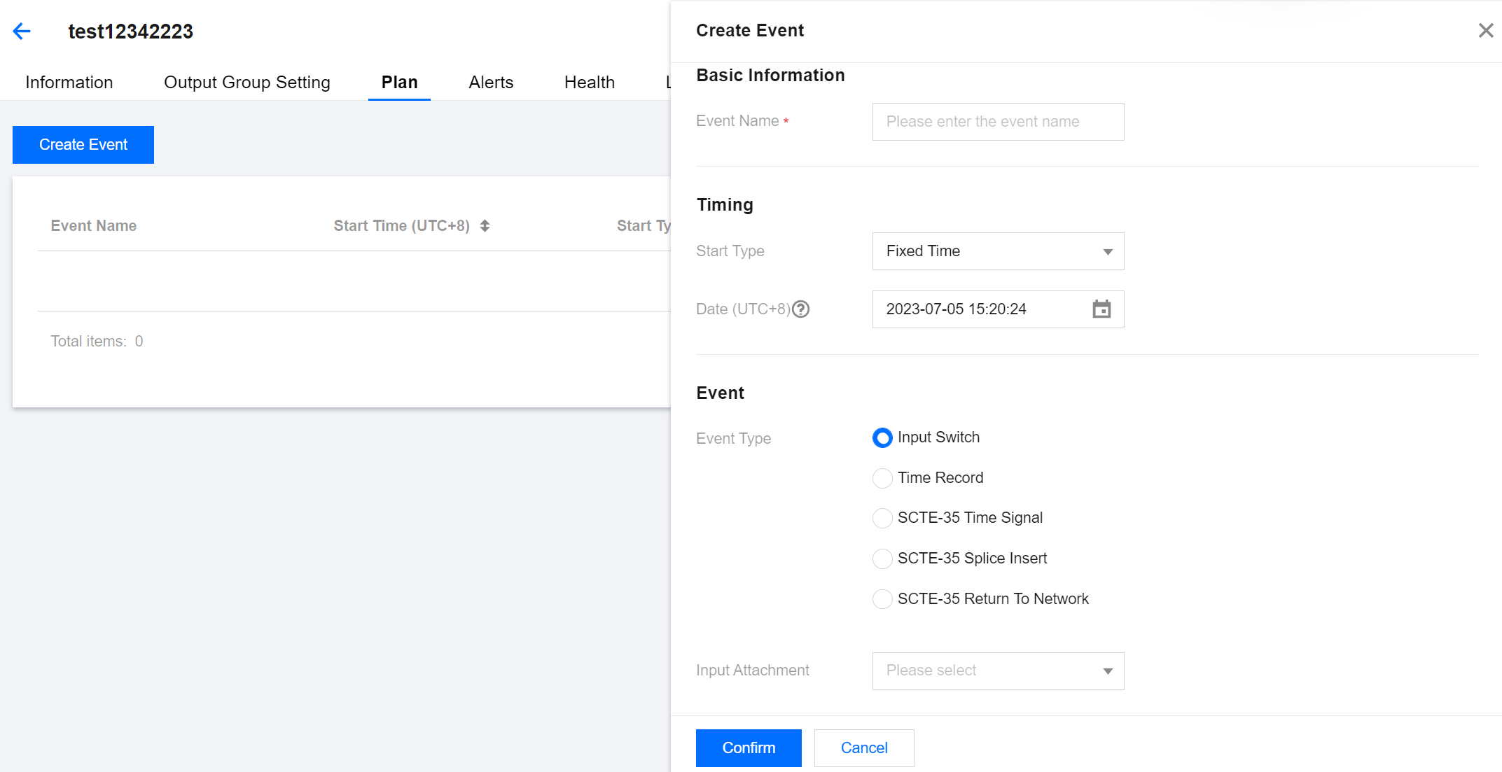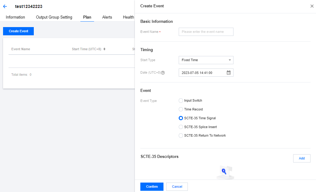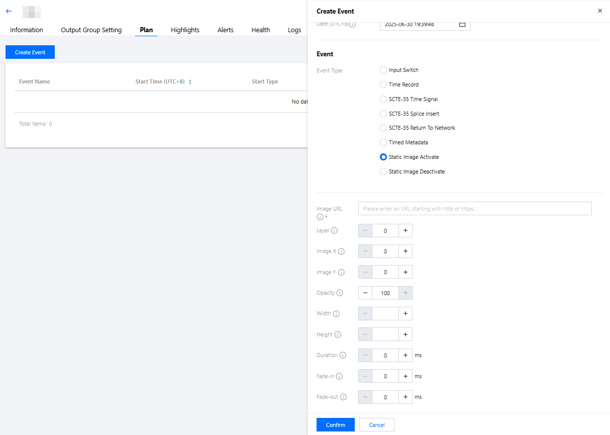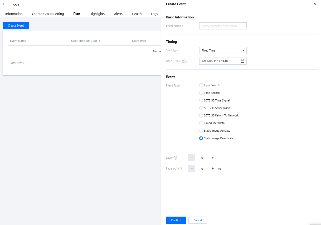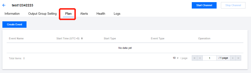 登录 StreamLive 控制台,在 Channel 中,单击需要设置 Plan 的频道名称,进入频道详情页面,然后选择详情页中的 Plan 标签页,即可看到当前频道下的 Plan 列表: 创建事件
