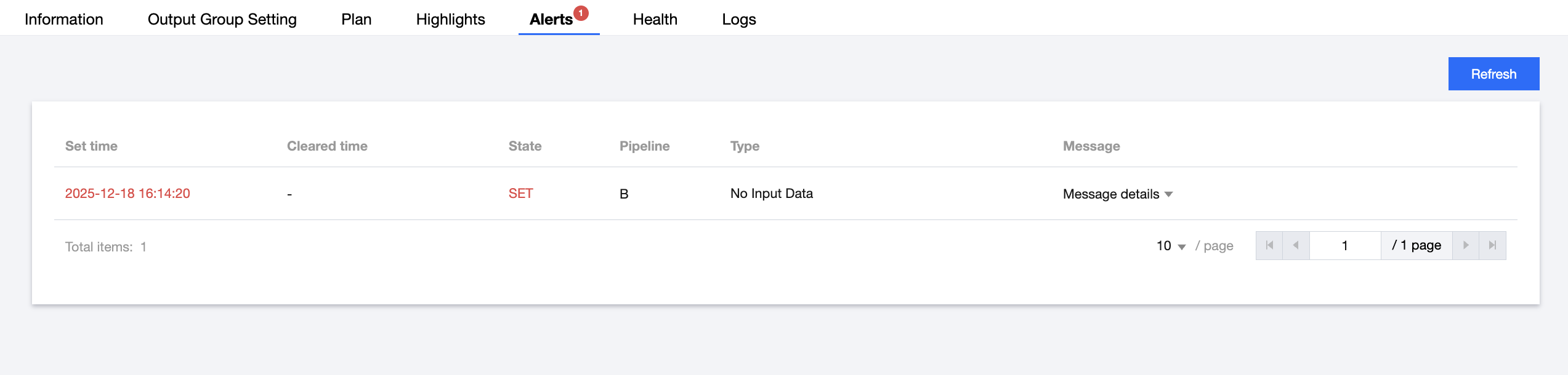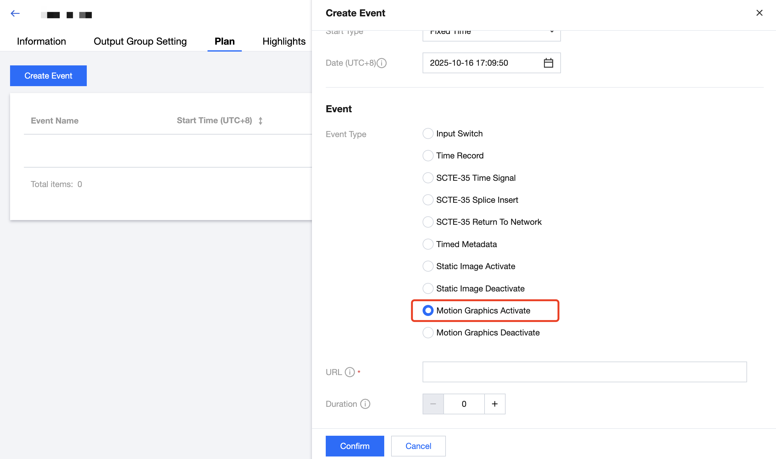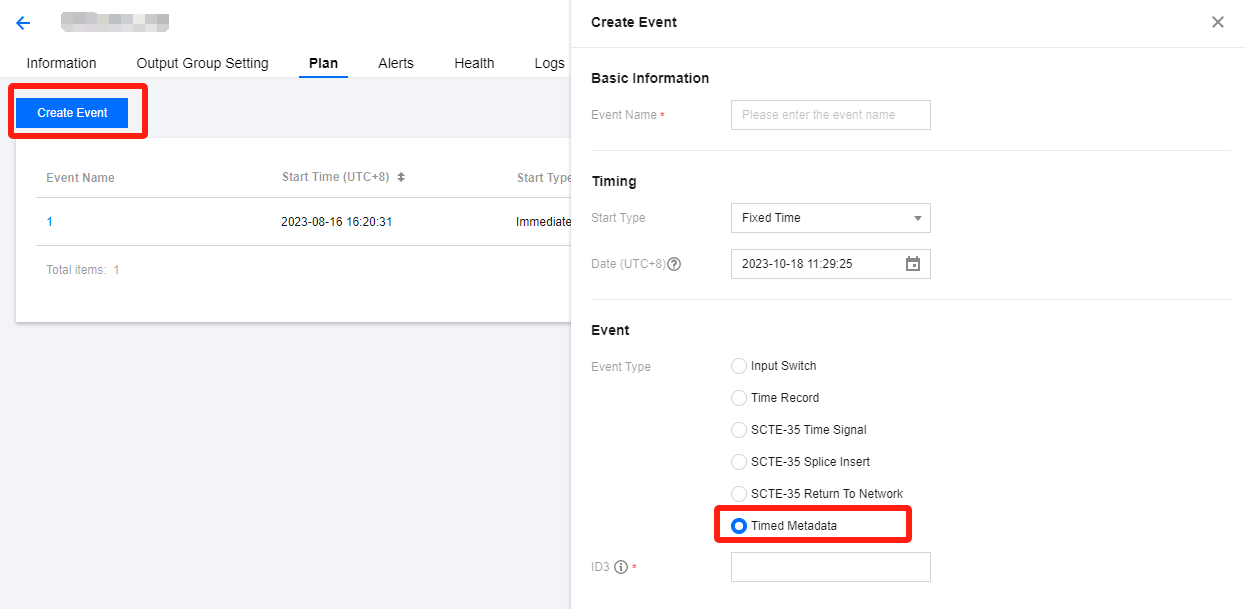 登录 StreamLive 控制台,在 Channel 中,单击需要设置 Plan 的频道名称,进入频道详情页面,然后选择详情页中的 Plan 标签页,即可看到当前频道下的 Plan 列表: 创建事件