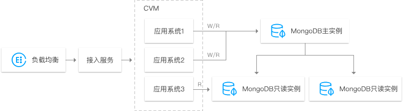 很多对数据及时性要求不是特别苛刻的应用,可通过购买 MongoDB 主实例的一个或者多个只读实例来实现读写分离需求,通过只读实例读操作来满足大量读应用需求,减轻主库压力。所有写请求会被发到主节点,主实例和只读实例之间会自动进行数据同步。